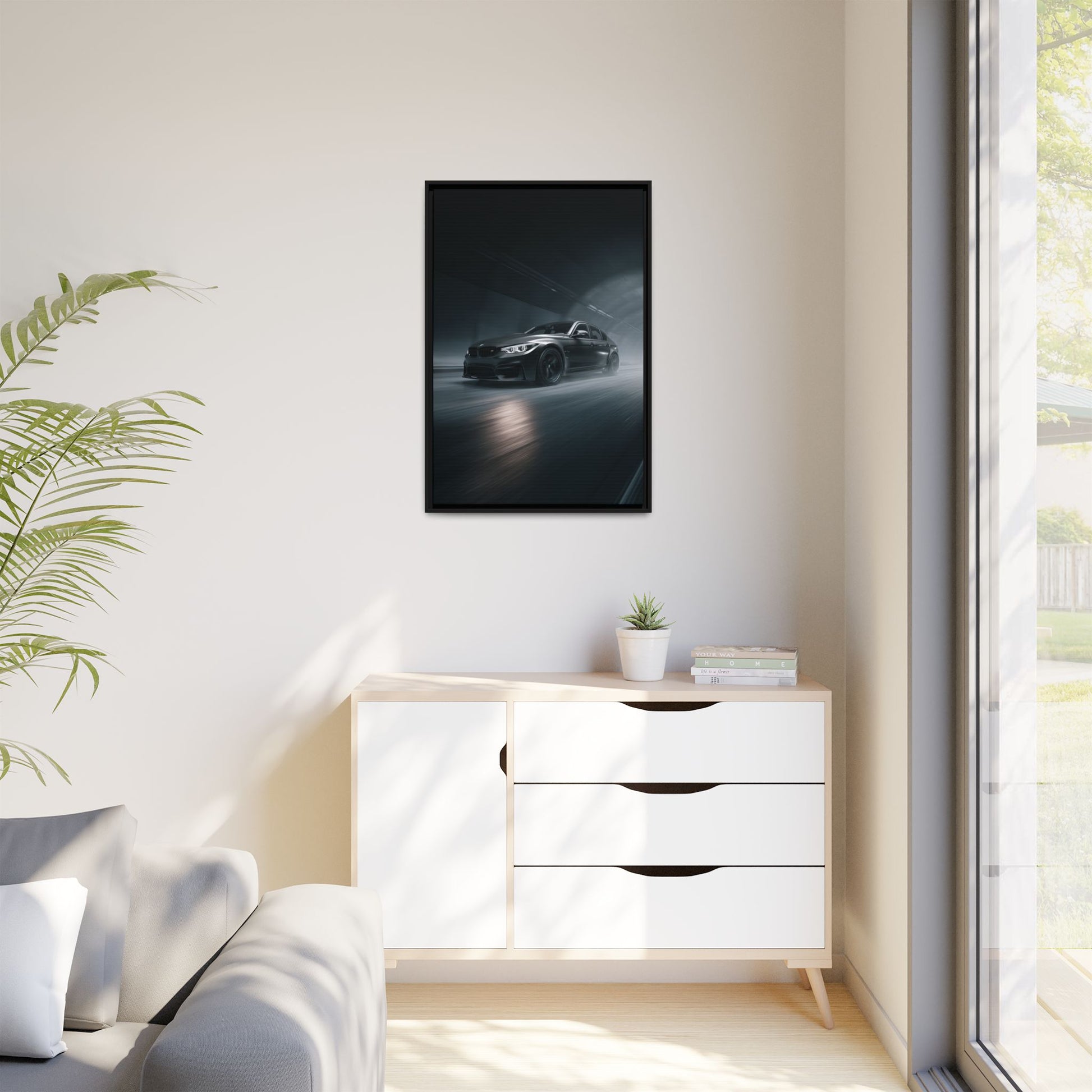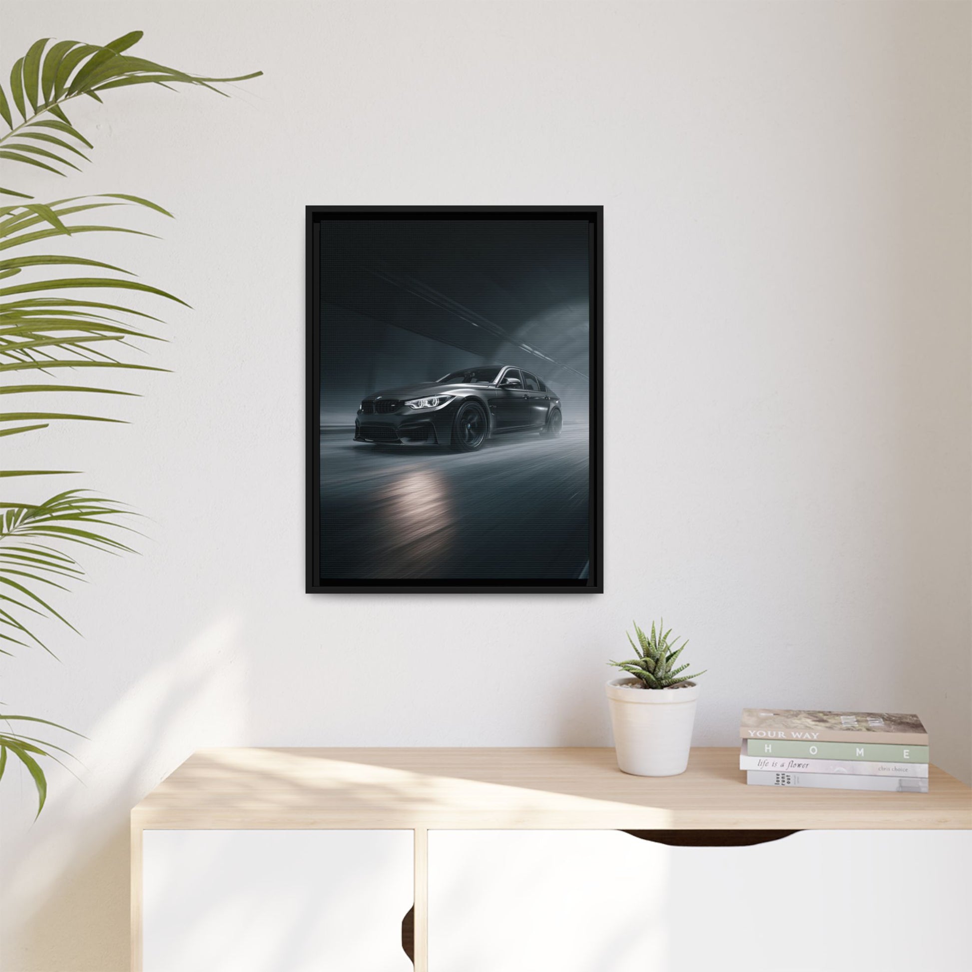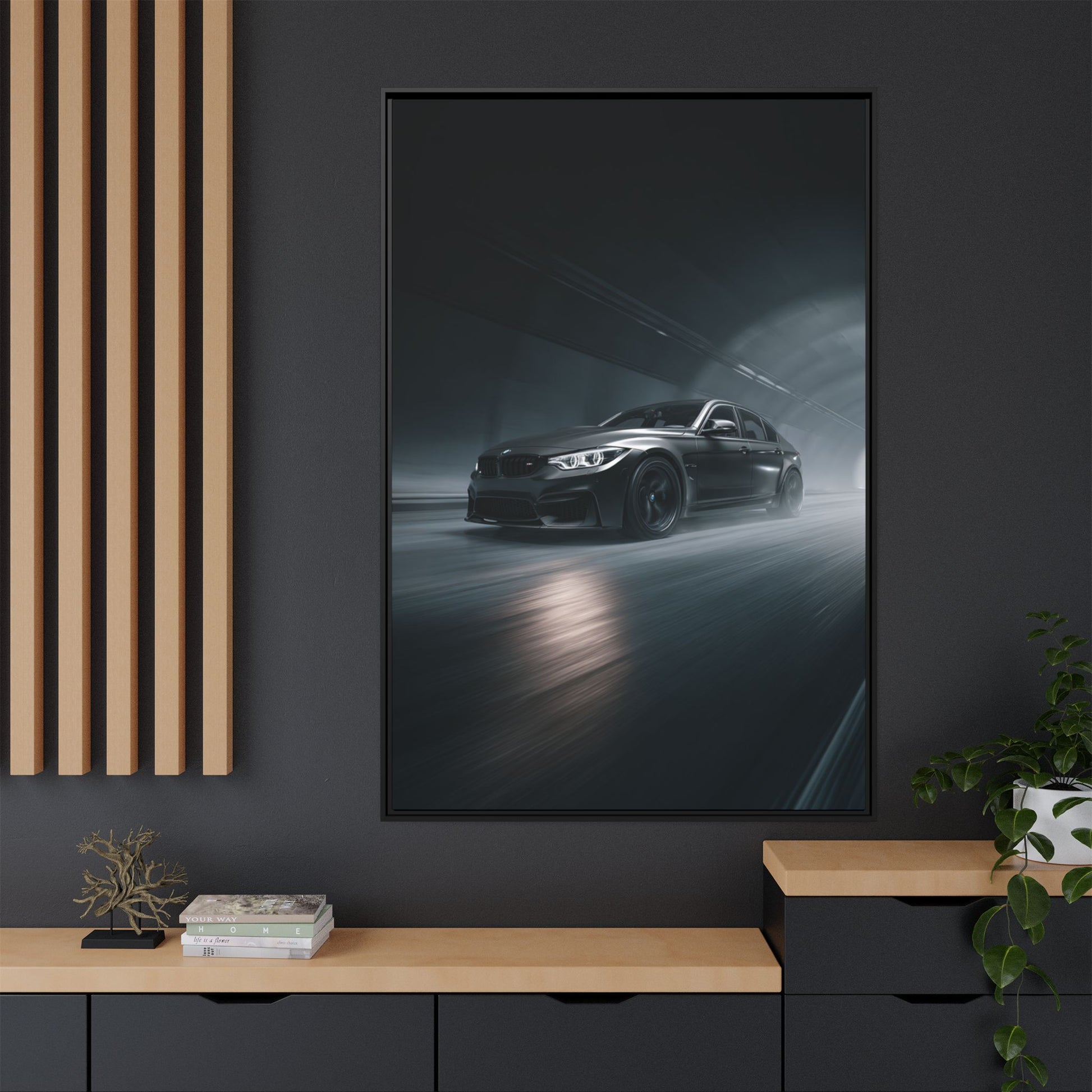 A refined matte canvas showcasing the BMW M3 distilled to its signature sport-focused form. Clean rim-lighting shapes the aggressive stance, sharp body lines, and signature M-design cues while keeping the composition minimalist and cinematic. Greenguard Gold–certified latex inks paired with a matte cotton-poly canvas create rich depth without glare, preserving every contour with gallery-level clarity.