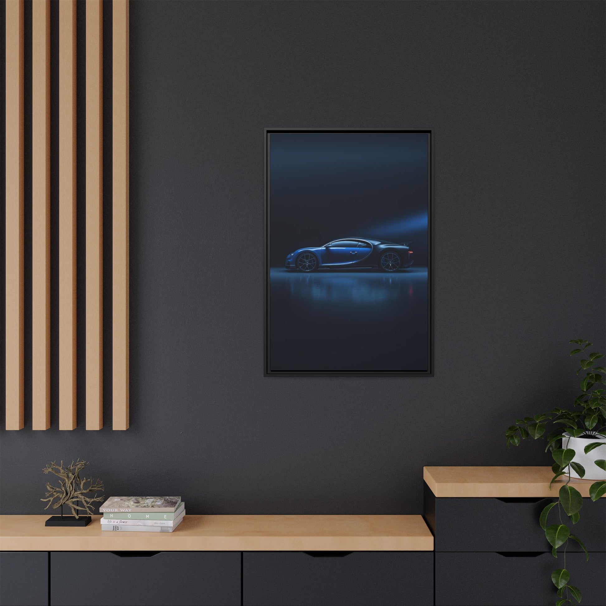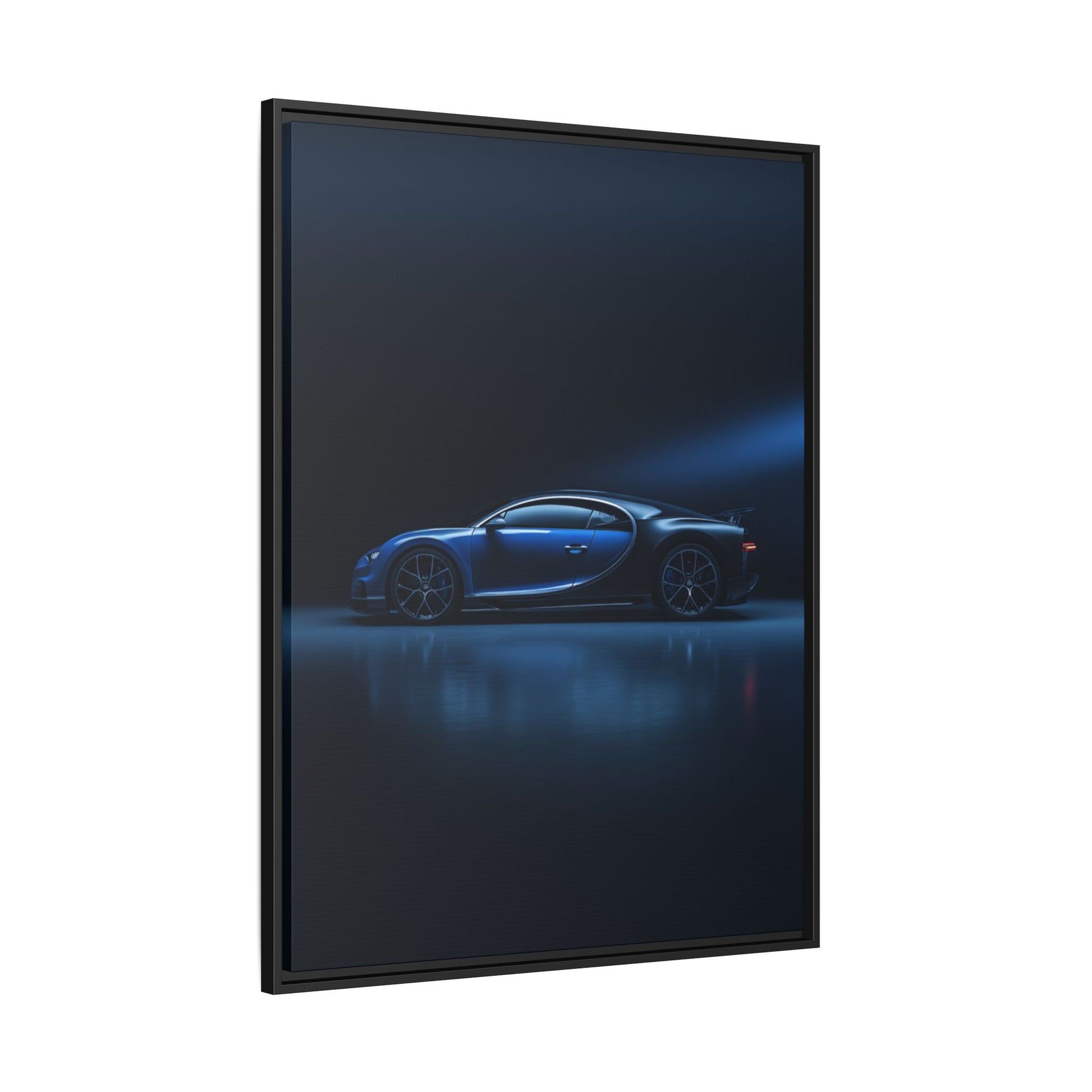 A cinematic matte canvas capturing the Bugatti Chiron in its sculpted, hypercar form. Dramatic rim-light defines the sweeping aerodynamic curves, horseshoe-inspired profile, and refined symmetry, set against a deep blue gradient backdrop that enhances the Chiron’s ultra-luxury presence with museum-grade depth and a glare-free matte finish.