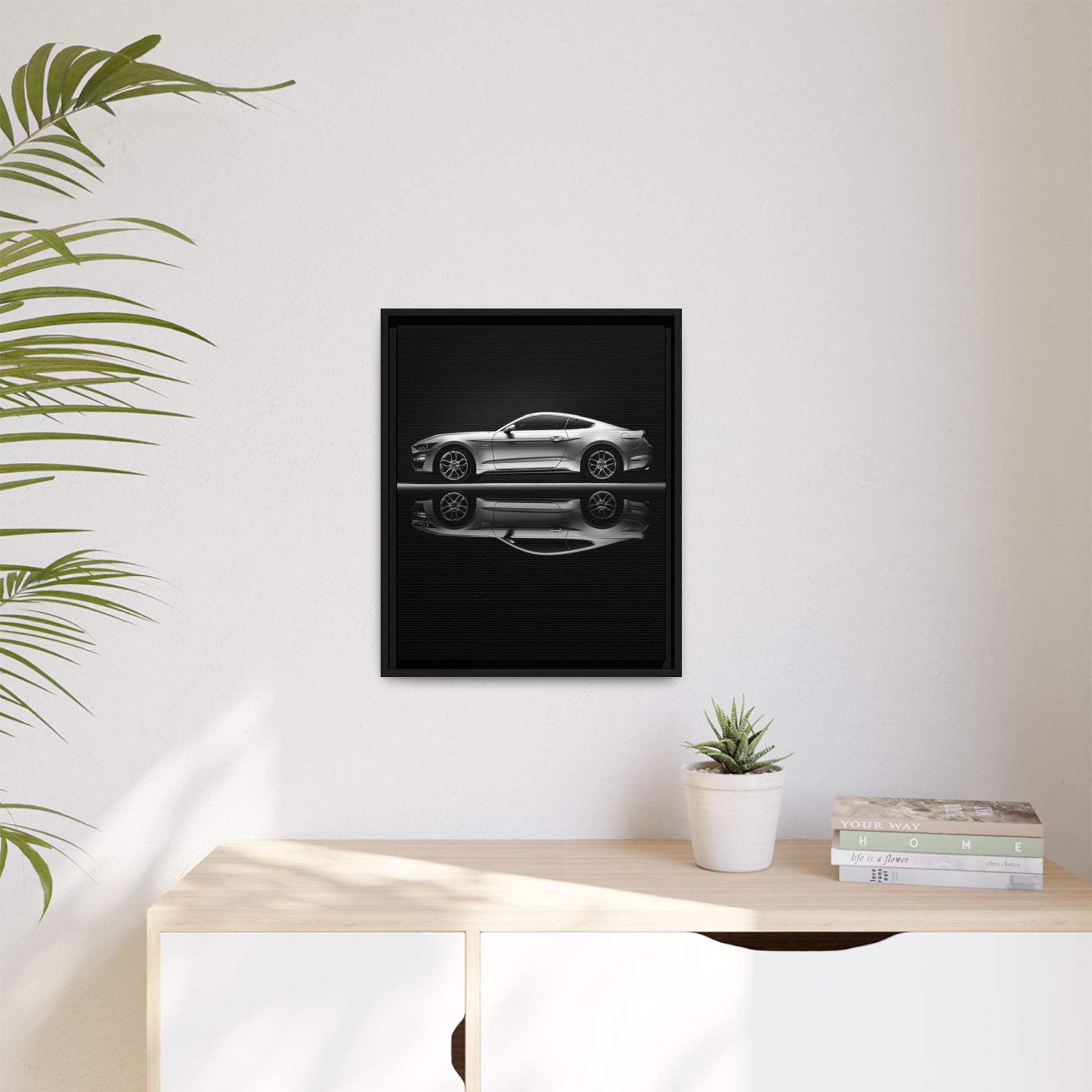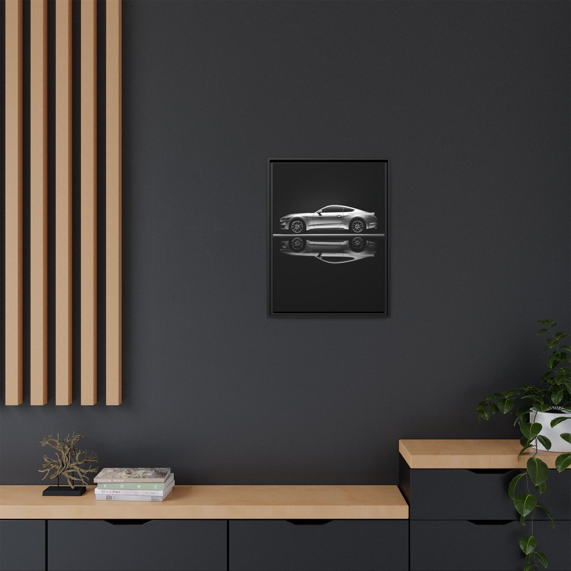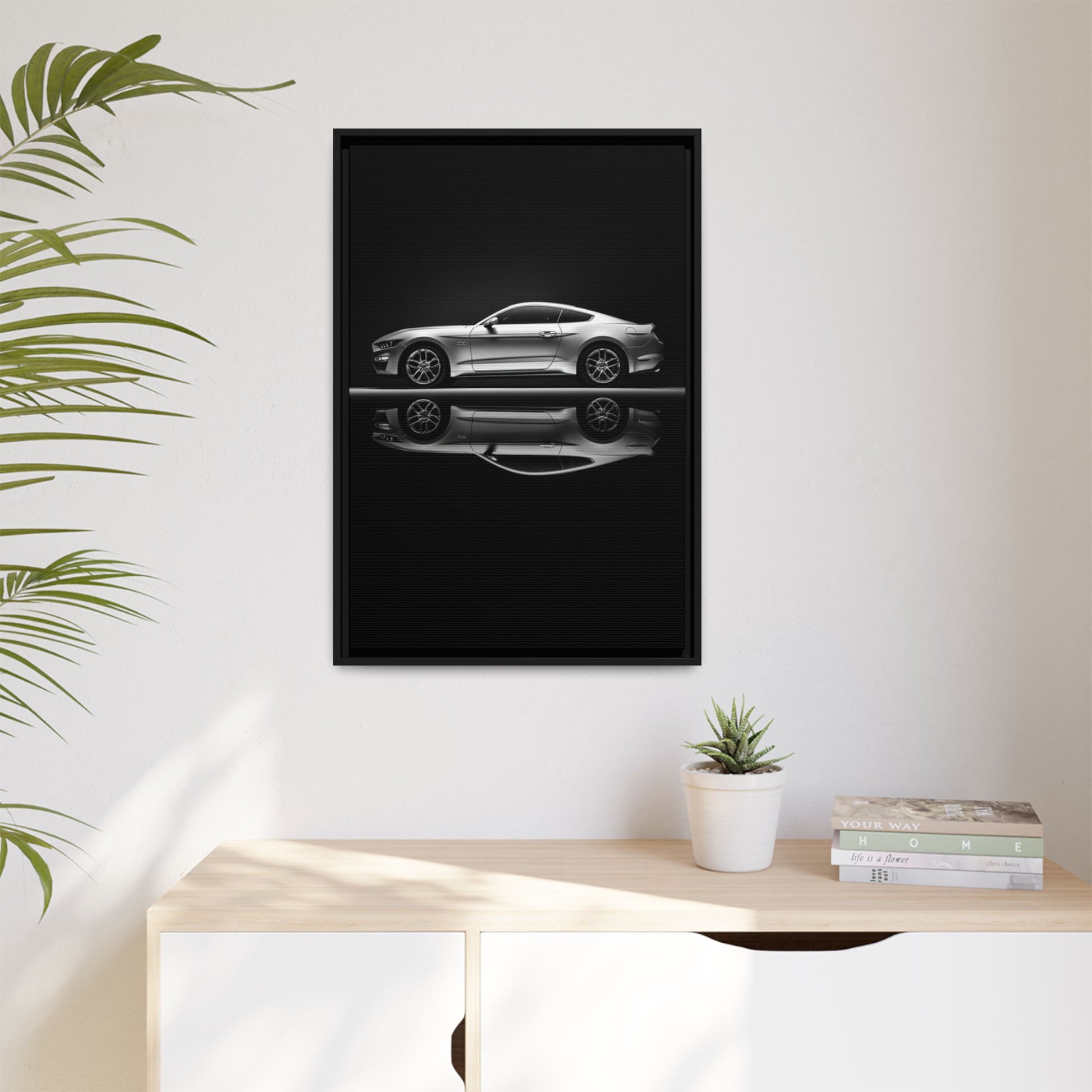 A cinematic matte canvas capturing the Ford Mustang GT (S550) in its unmistakable modern-muscle form. Dramatic rim-lighting reveals the sculpted hood, aggressive front fascia, and fastback profile, creating a clean, high-contrast silhouette with museum-grade depth. Designed for garages, offices, and modern interiors, this artwork blends raw V8 attitude with refined minimalist aesthetics.