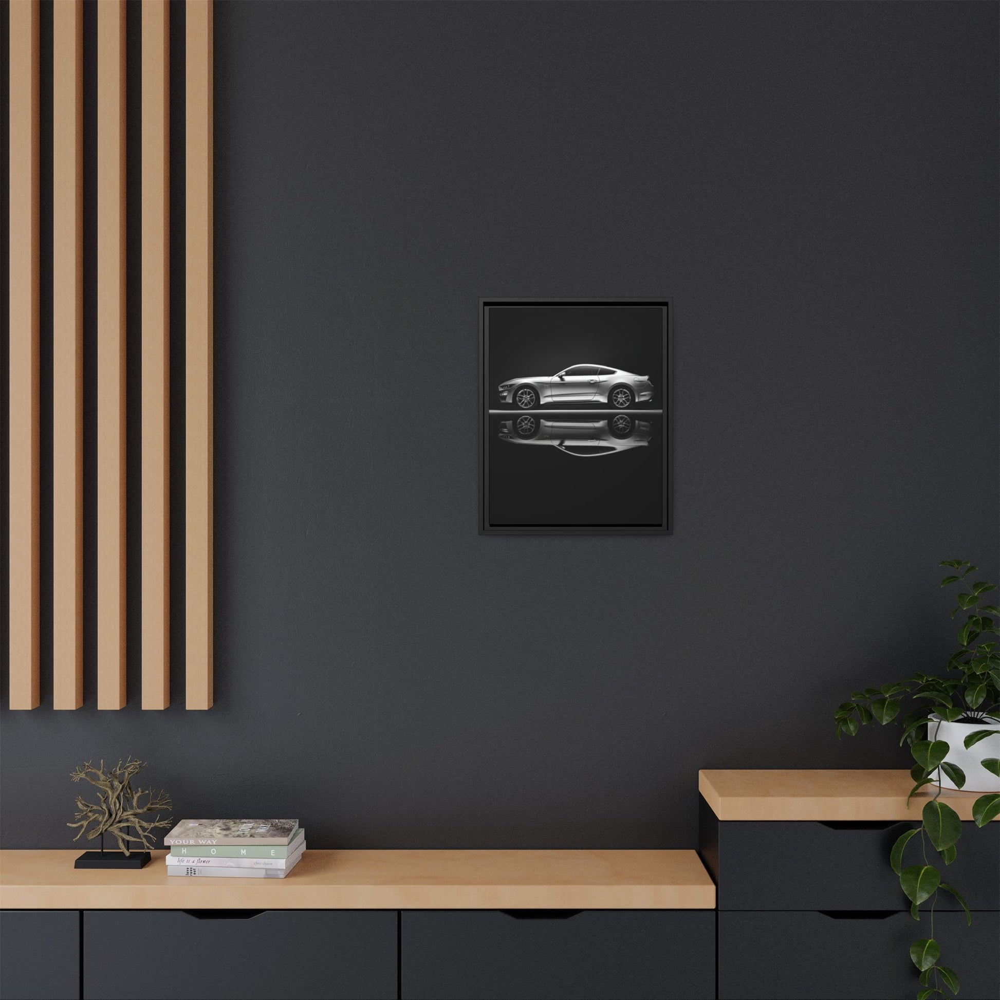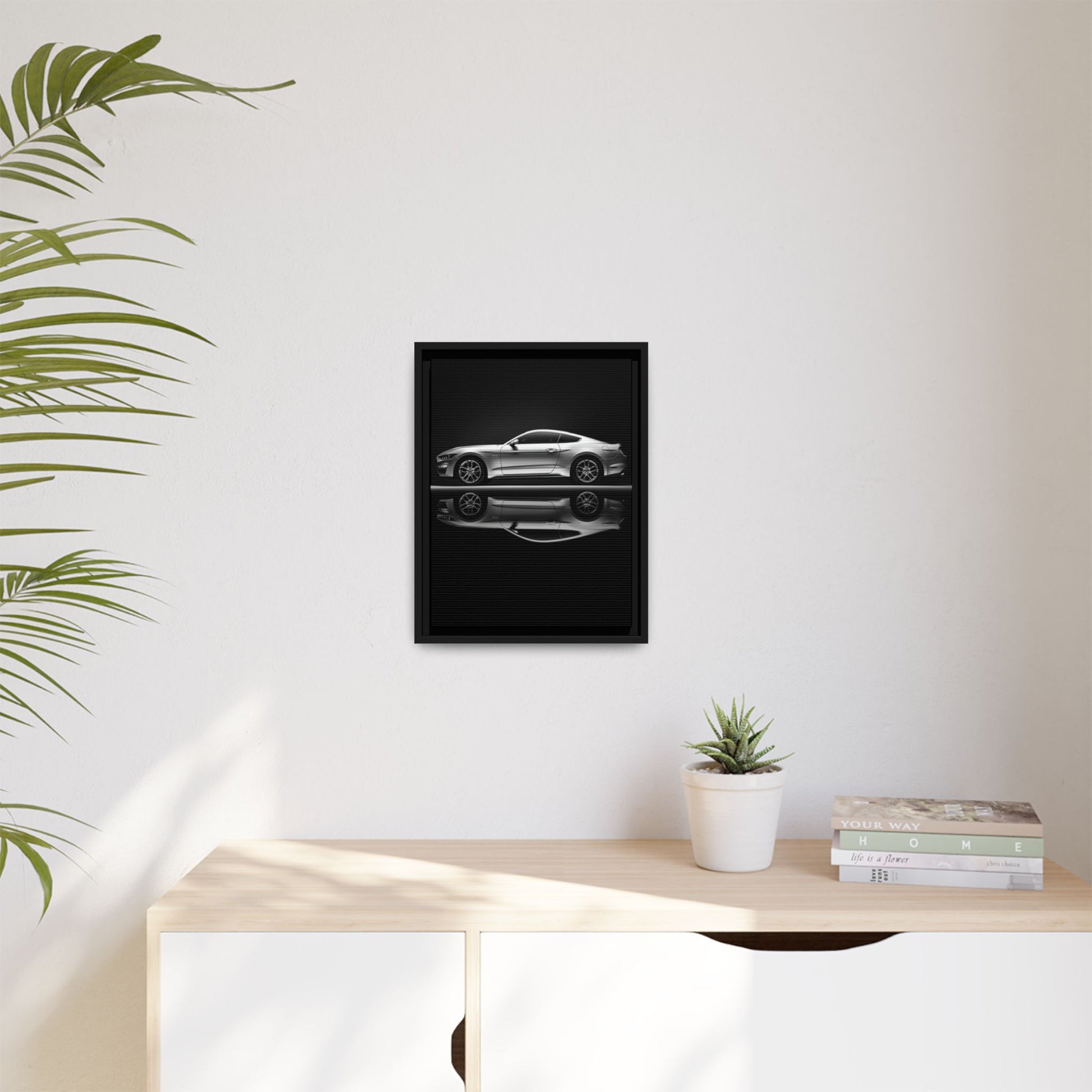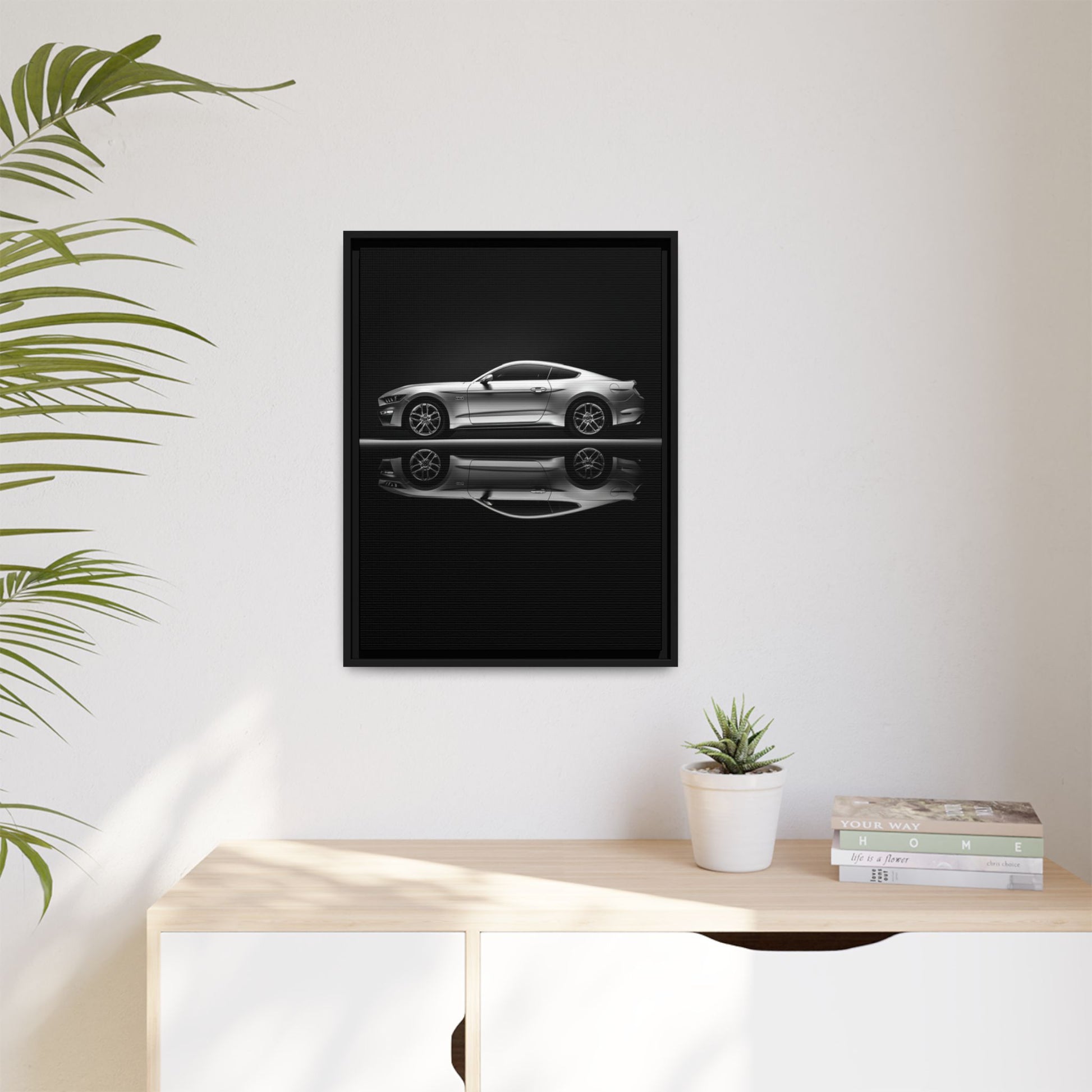 A cinematic matte canvas capturing the Ford Mustang GT (S550) in its unmistakable modern-muscle form. Dramatic rim-lighting reveals the sculpted hood, aggressive front fascia, and fastback profile, creating a clean, high-contrast silhouette with museum-grade depth. Designed for garages, offices, and modern interiors, this artwork blends raw V8 attitude with refined minimalist aesthetics.