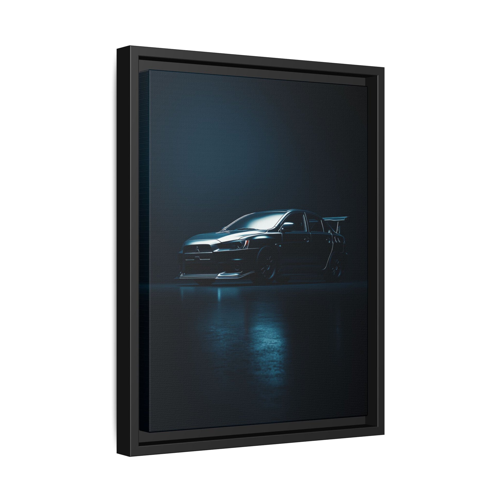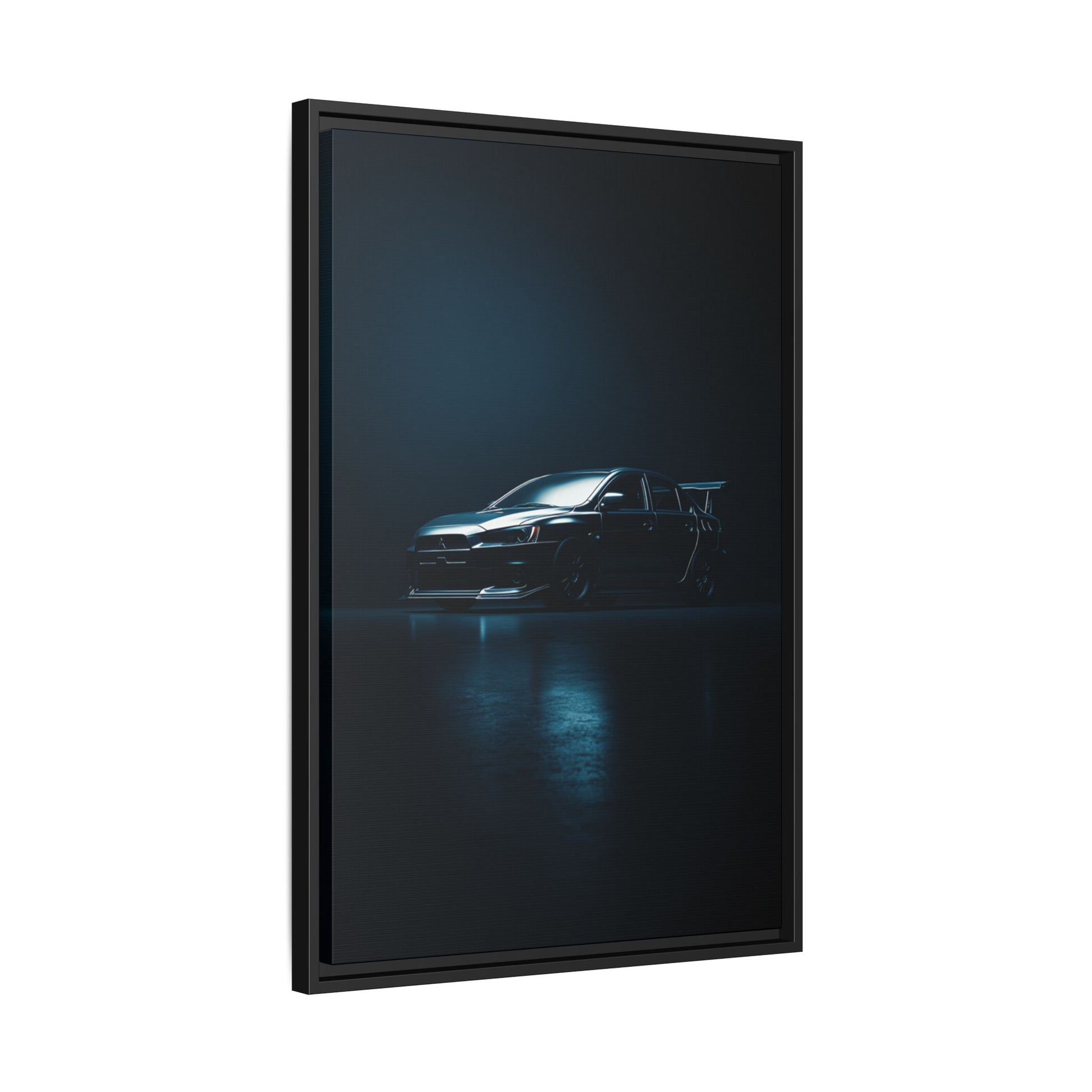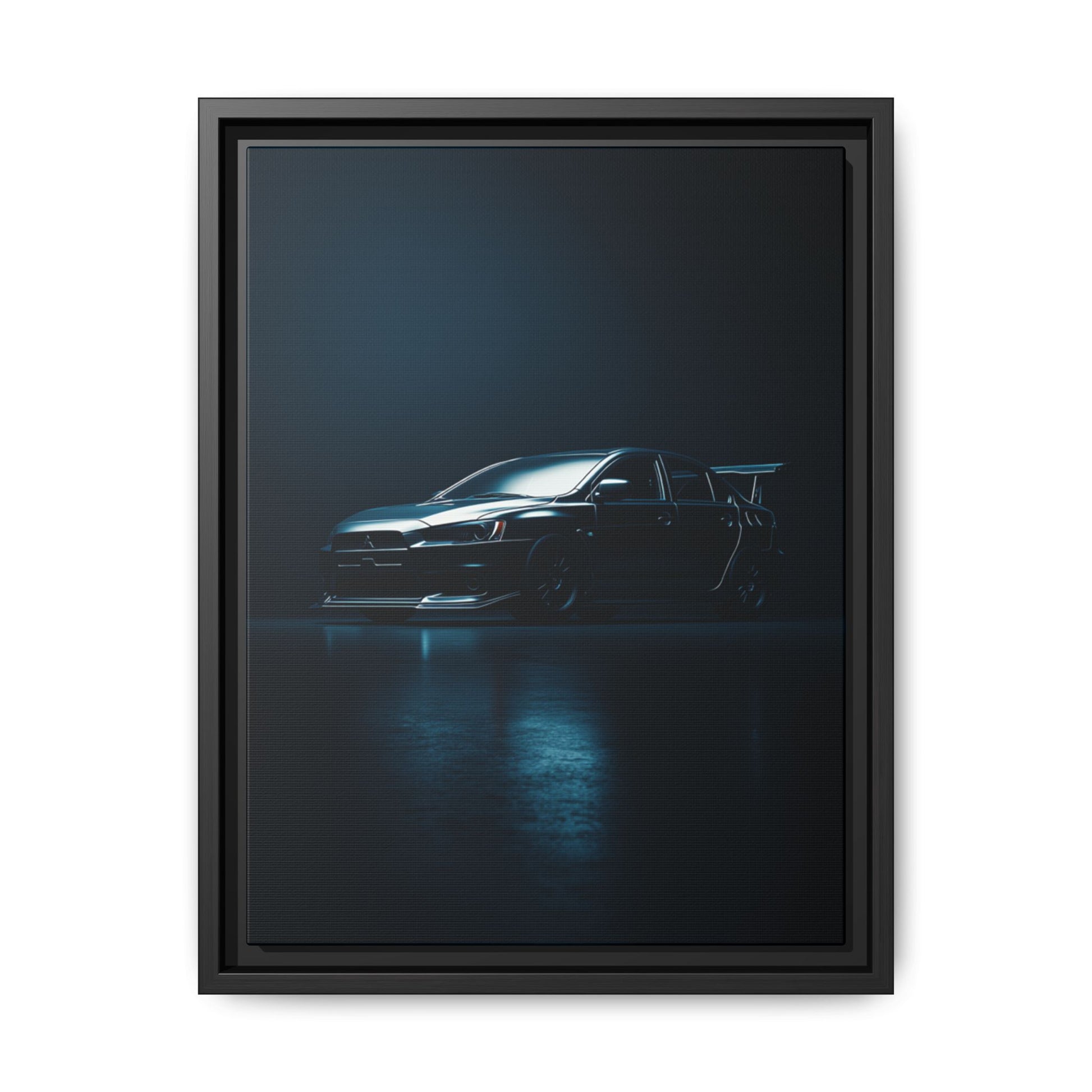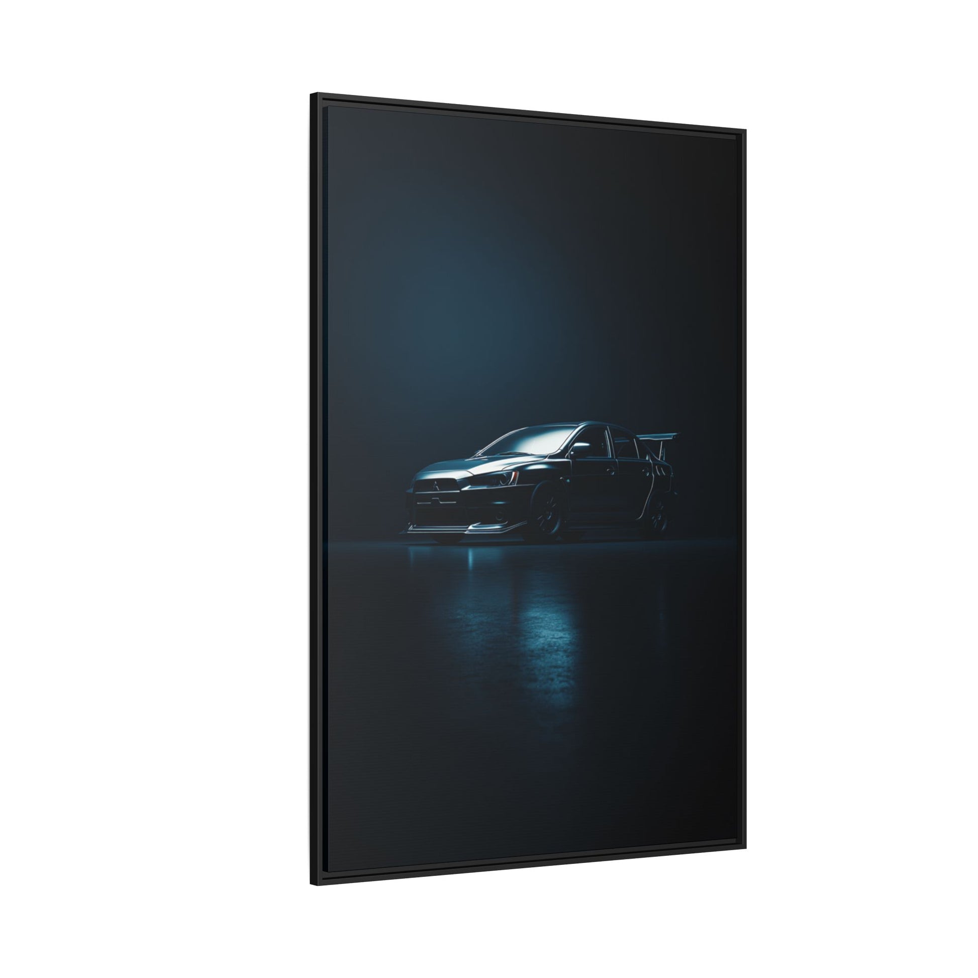 A cinematic matte canvas showcasing the Mitsubishi Lancer Evolution X in a sharp, high-contrast silhouette. Icy blue rim-lighting outlines its aggressive front fascia, wide rally-bred stance, and signature rear wing—capturing the essence of Mitsubishi’s iconic AWD performance machine. Printed on museum-grade matte canvas with Greenguard Gold–certified inks, this artwork blends tuner culture with minimalist luxury, ideal for garages, studios, offices, and modern interiors.