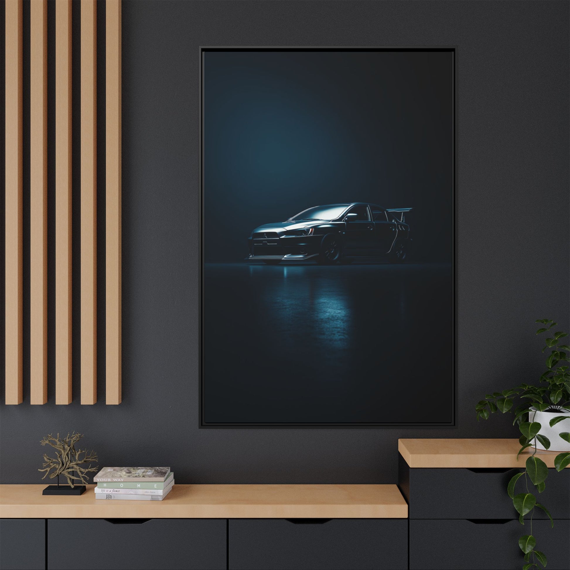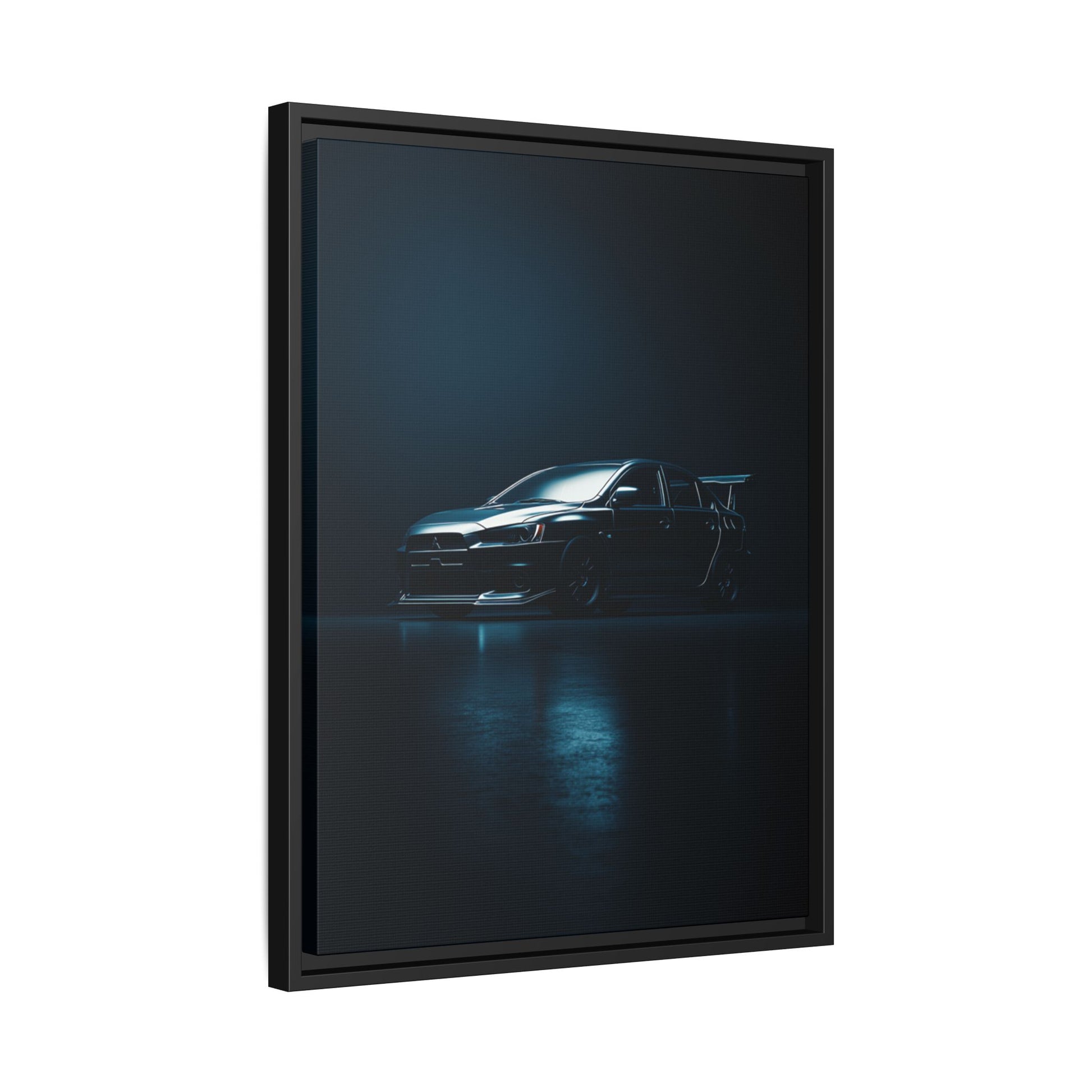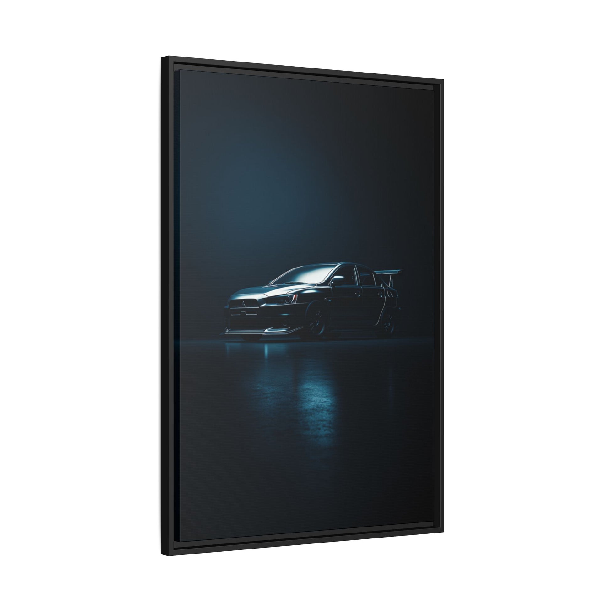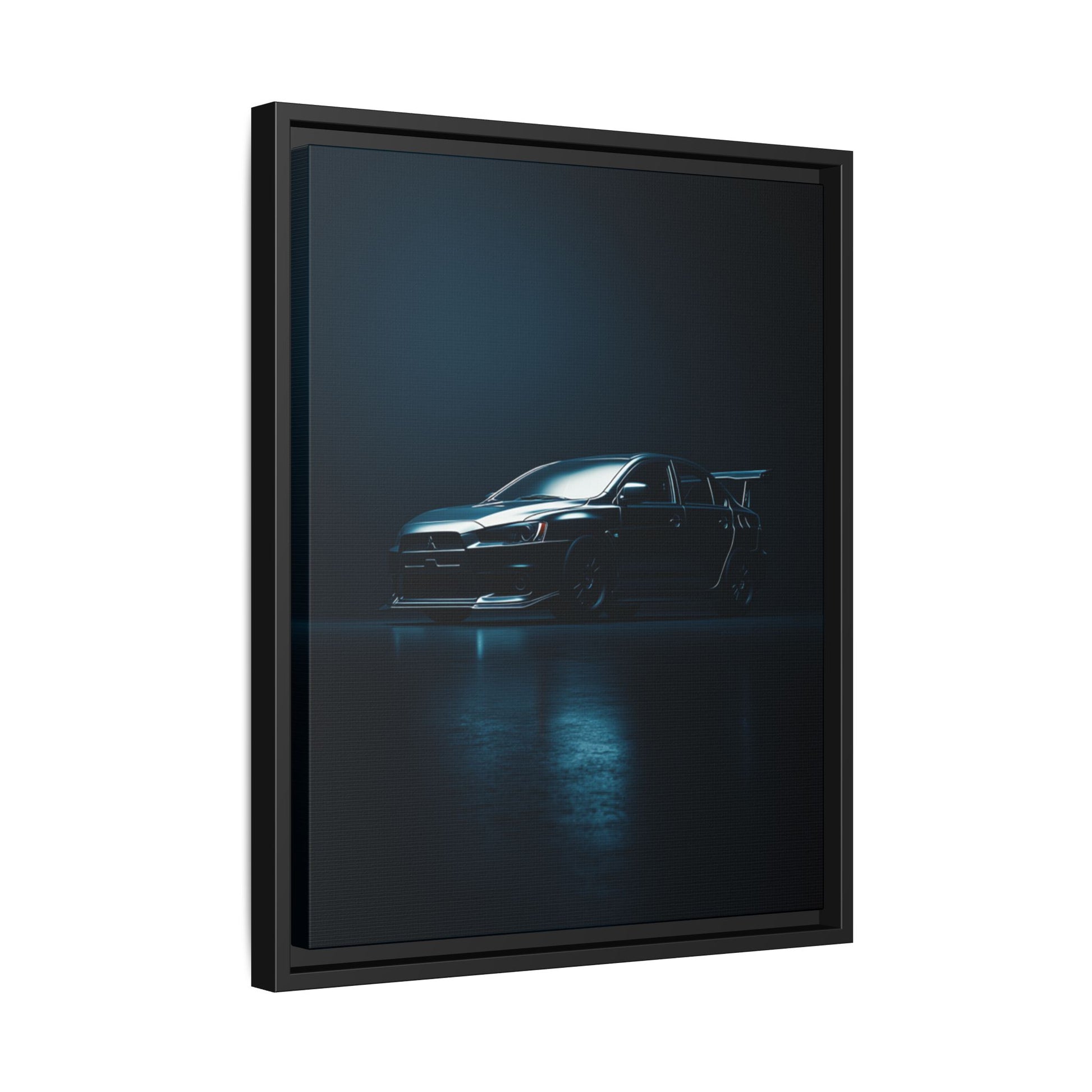 A cinematic matte canvas showcasing the Mitsubishi Lancer Evolution X in a sharp, high-contrast silhouette. Icy blue rim-lighting outlines its aggressive front fascia, wide rally-bred stance, and signature rear wing—capturing the essence of Mitsubishi’s iconic AWD performance machine. Printed on museum-grade matte canvas with Greenguard Gold–certified inks, this artwork blends tuner culture with minimalist luxury, ideal for garages, studios, offices, and modern interiors.