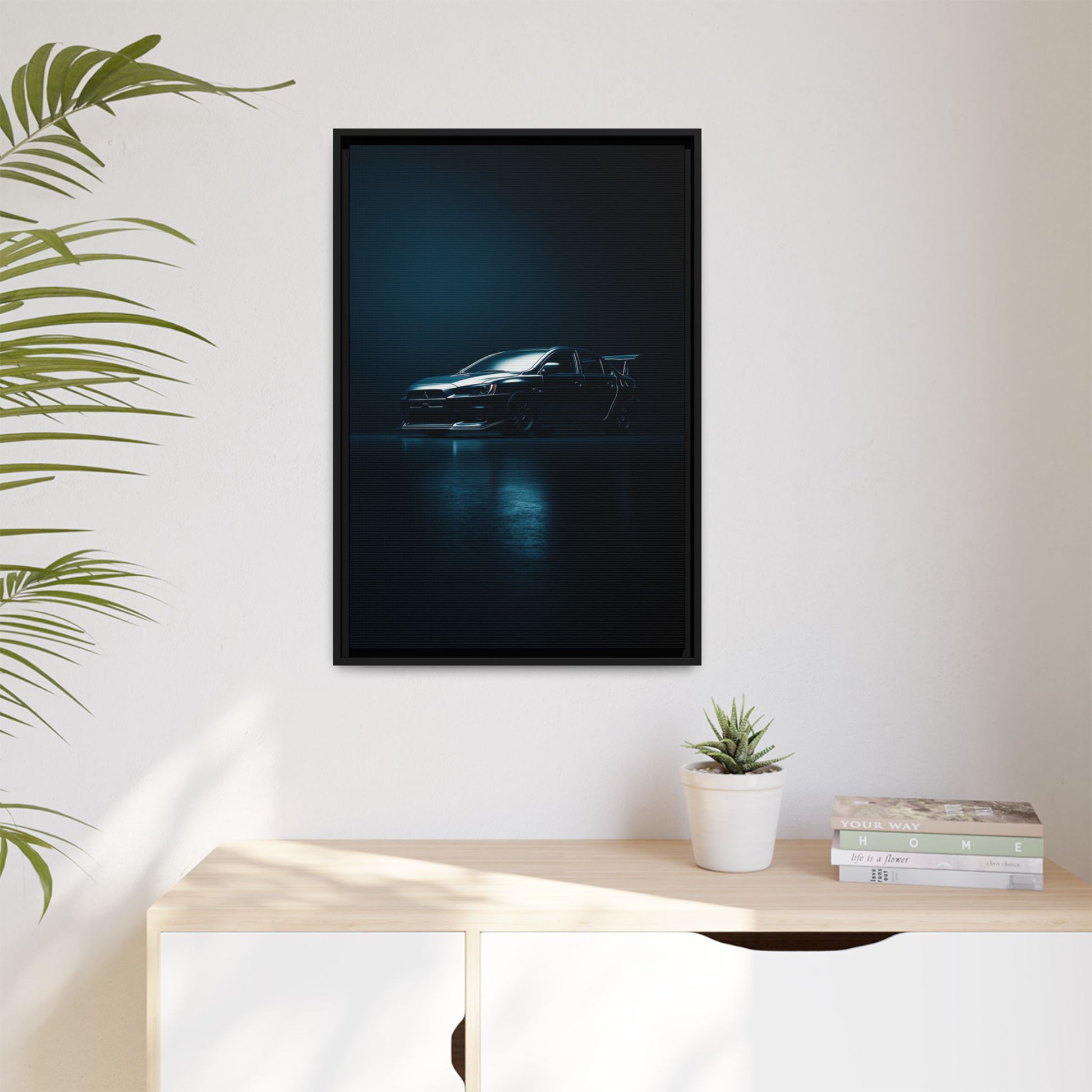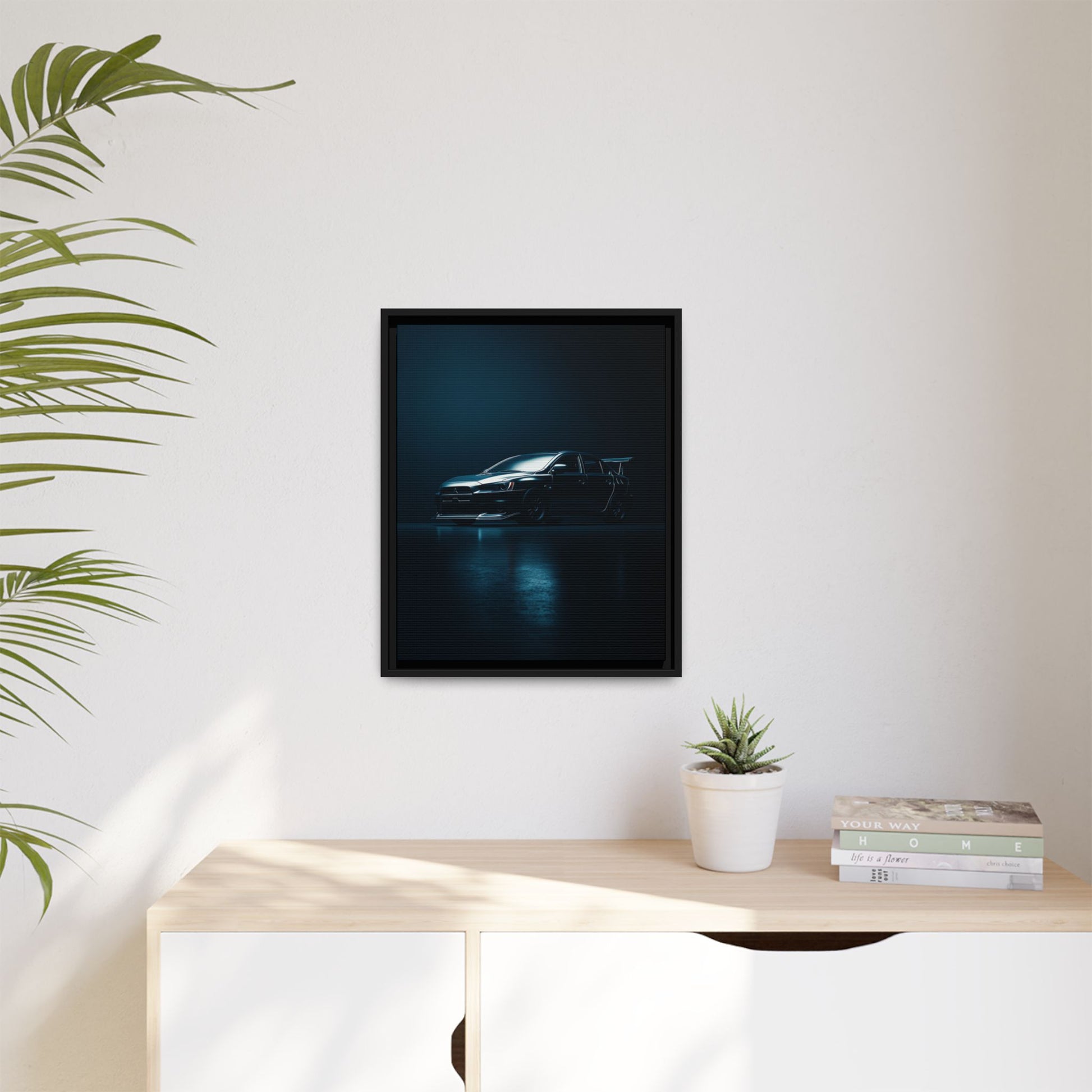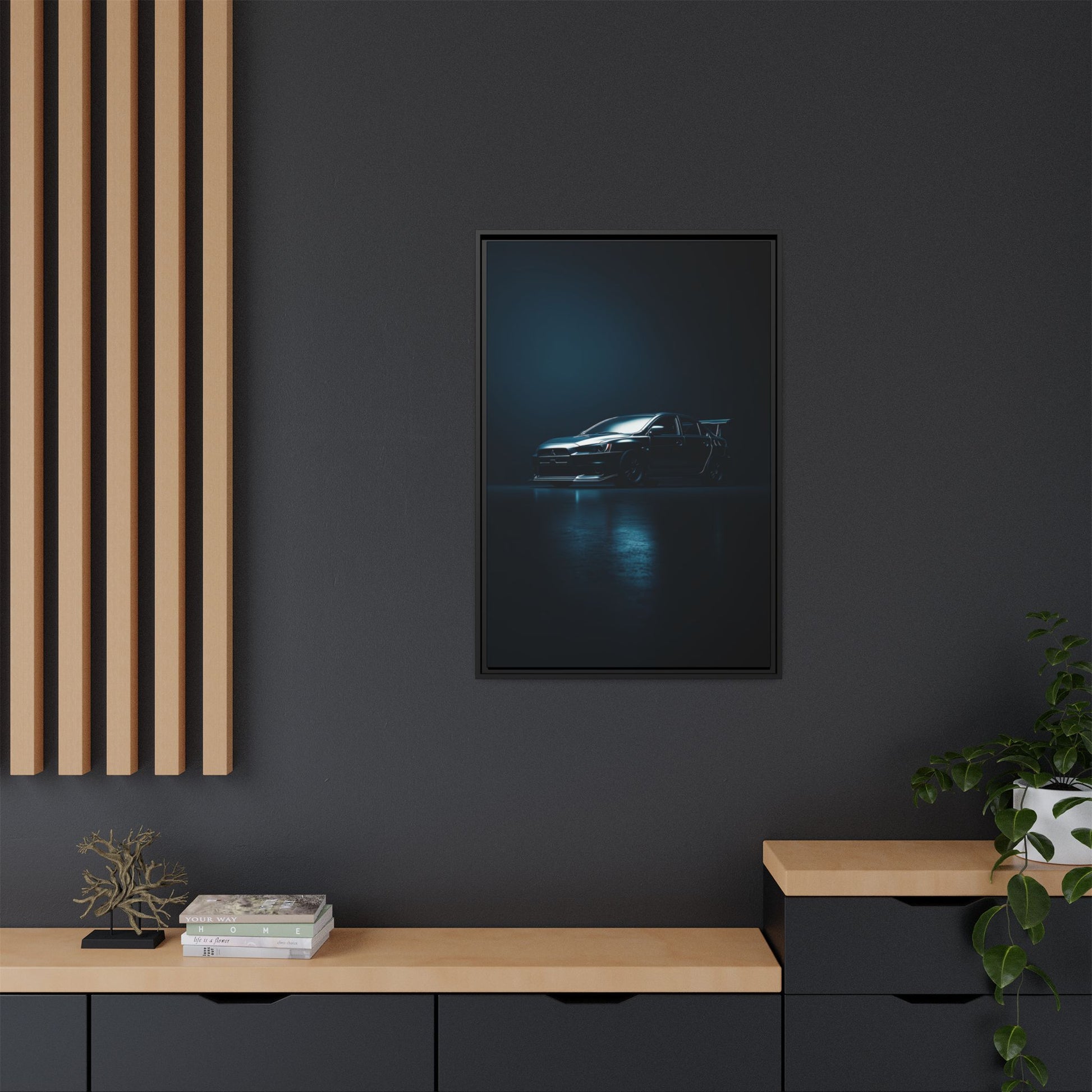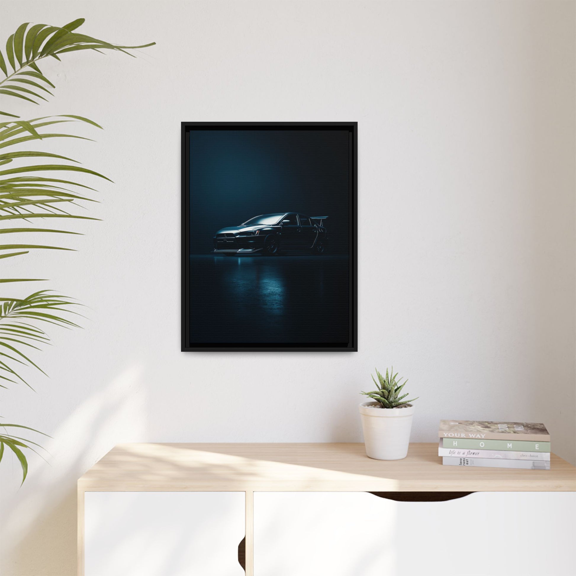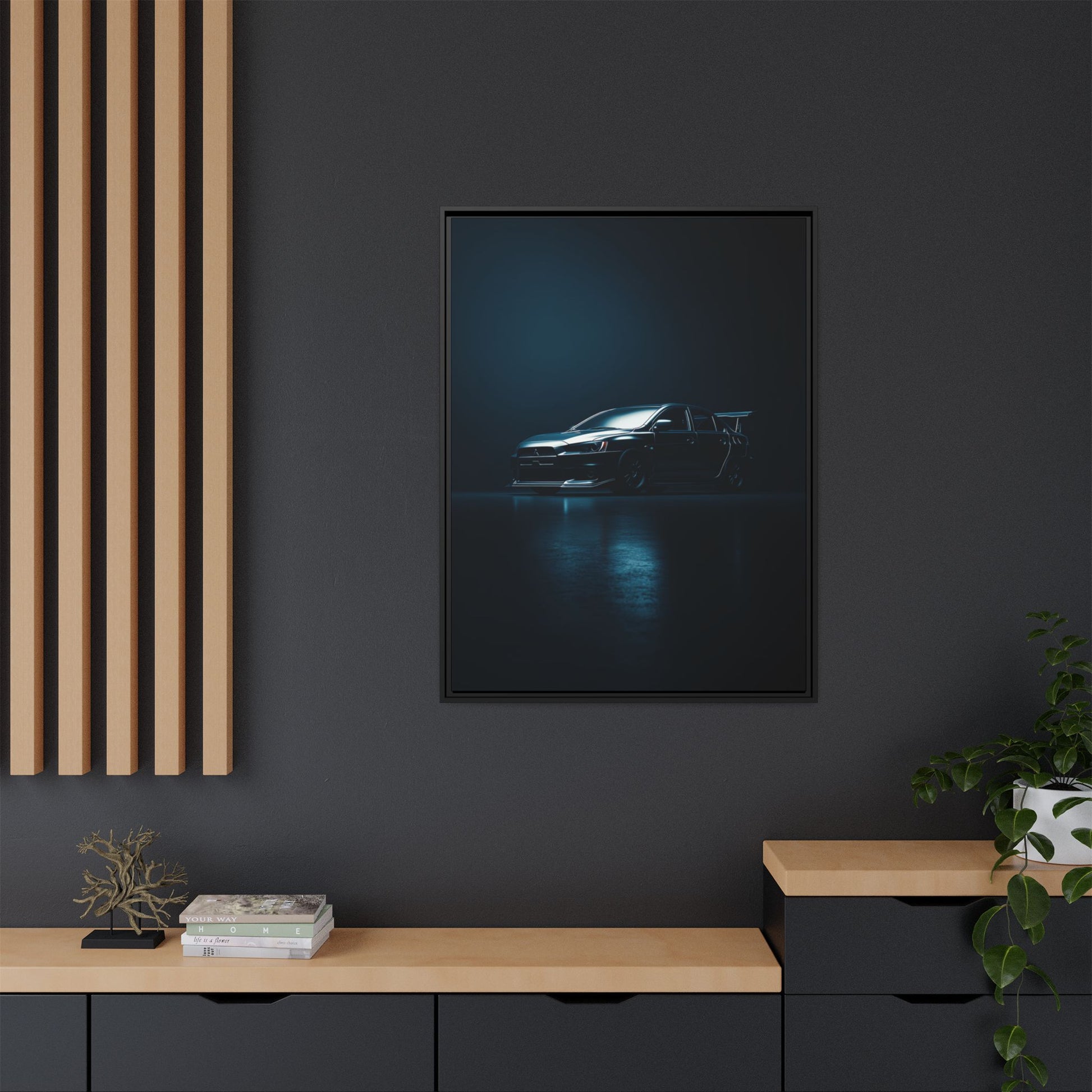 A cinematic matte canvas showcasing the Mitsubishi Lancer Evolution X in a sharp, high-contrast silhouette. Icy blue rim-lighting outlines its aggressive front fascia, wide rally-bred stance, and signature rear wing—capturing the essence of Mitsubishi’s iconic AWD performance machine. Printed on museum-grade matte canvas with Greenguard Gold–certified inks, this artwork blends tuner culture with minimalist luxury, ideal for garages, studios, offices, and modern interiors.