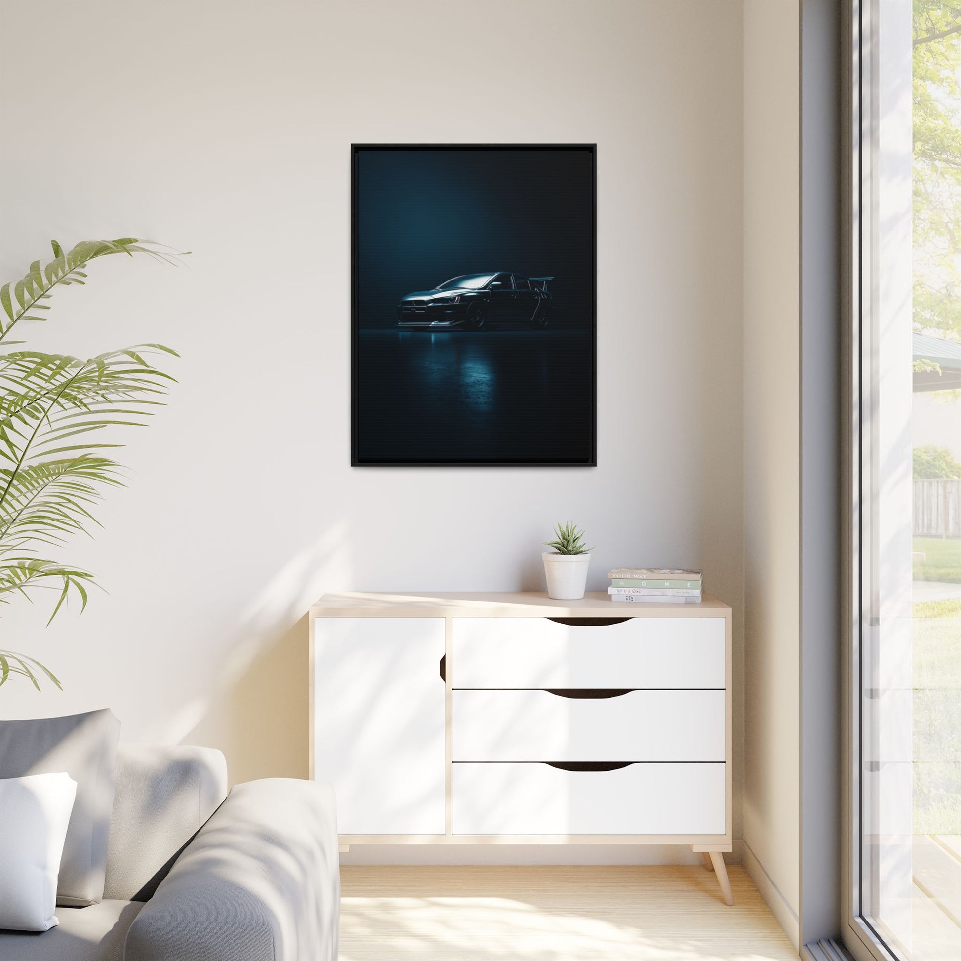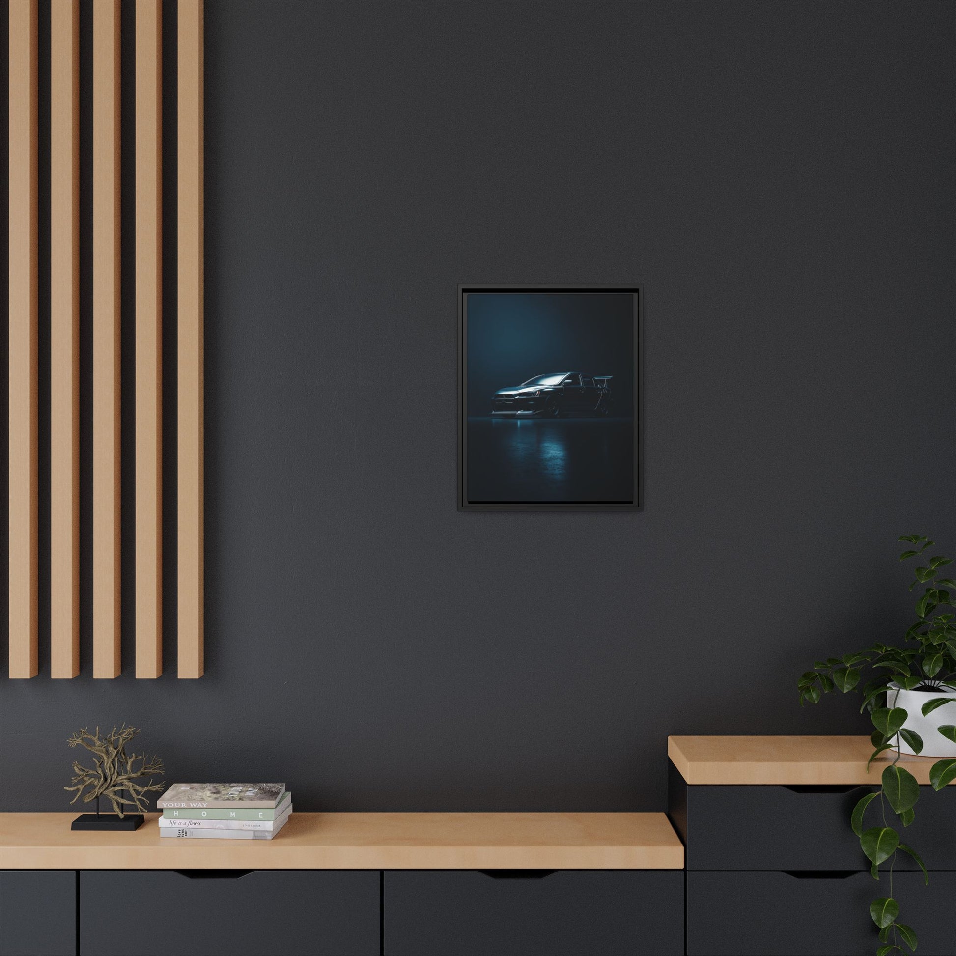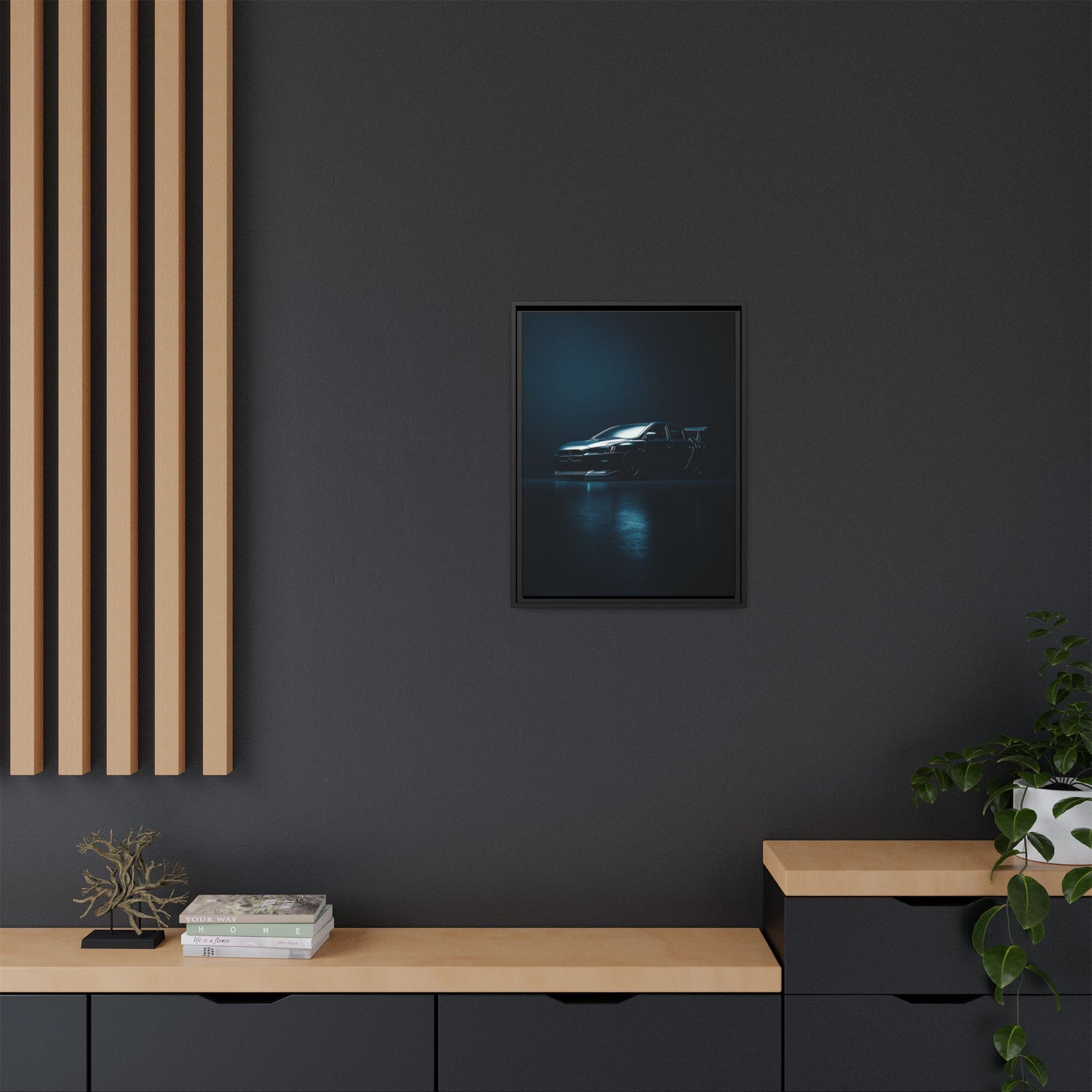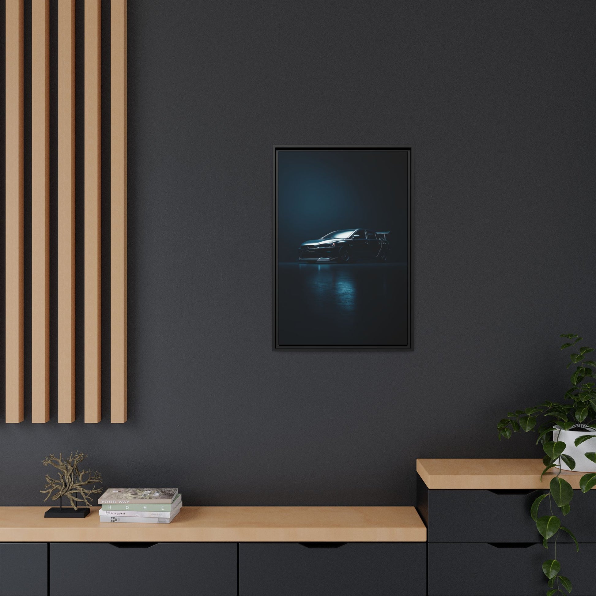 A cinematic matte canvas showcasing the Mitsubishi Lancer Evolution X in a sharp, high-contrast silhouette. Icy blue rim-lighting outlines its aggressive front fascia, wide rally-bred stance, and signature rear wing—capturing the essence of Mitsubishi’s iconic AWD performance machine. Printed on museum-grade matte canvas with Greenguard Gold–certified inks, this artwork blends tuner culture with minimalist luxury, ideal for garages, studios, offices, and modern interiors.